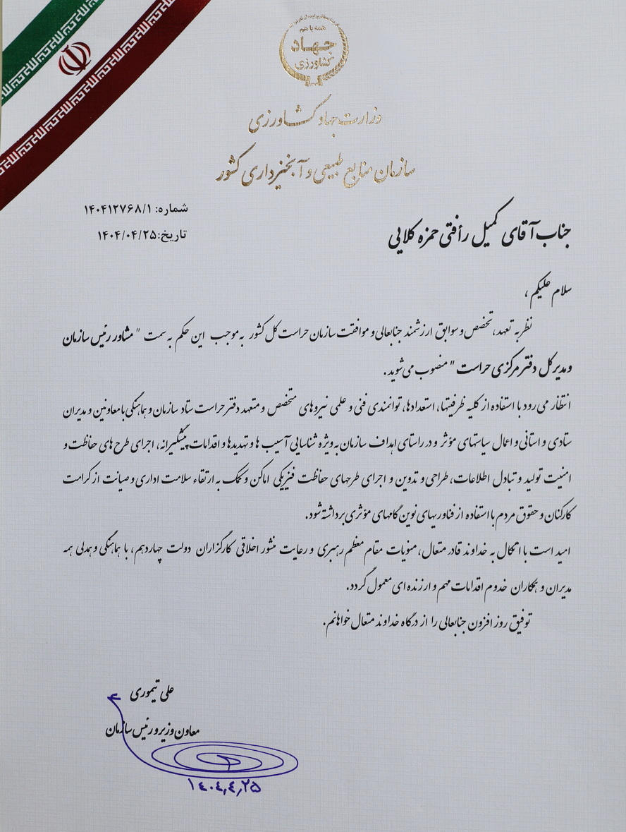 مدیرکل جدید دفتر مرکزی حراست سازمان منابع طبیعی و آبخیزداری کشور منصوب شد